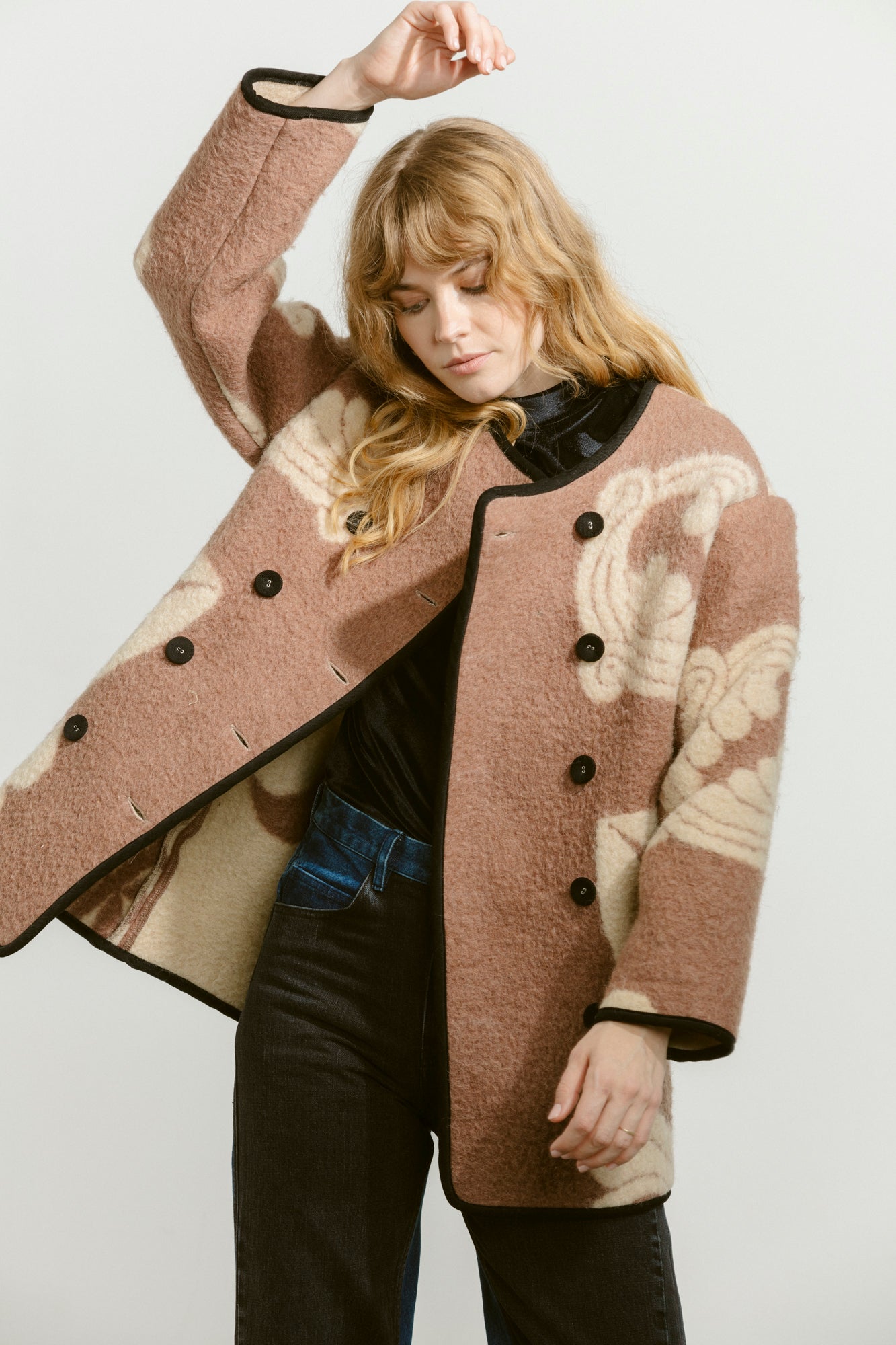 Our one-of-a-kind Brookes Jackets are made from wool blankets that have withstood the test of time and kept us warm for so long. Now we get to wear them out of the house! Finished with a black corduroy trim and a timeless double breasted button closure. This jacket also comes with two side pockets and looks great both open and fully buttoned. We love the dramatic (and effective!) length of this jacket.