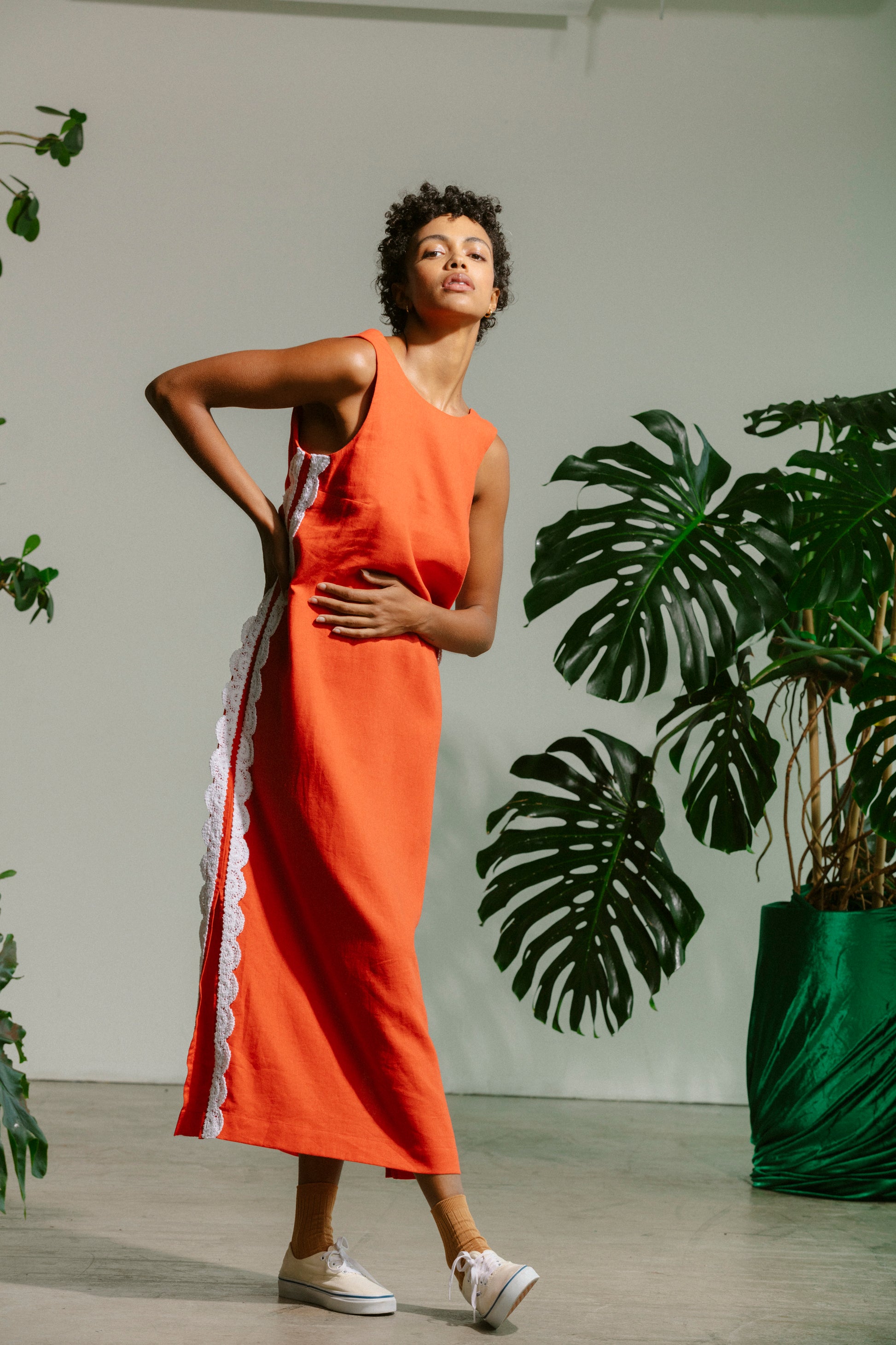 Wear it on vacation, or treat any day like a vacation. This dress is the pop of color you've been looking for. Made of super-soft linen, it's a breezy piece to wear as a guest to a dinner party, or if you're fancy, on a boat. Finished with locally-sourced deadstock crochet trim.