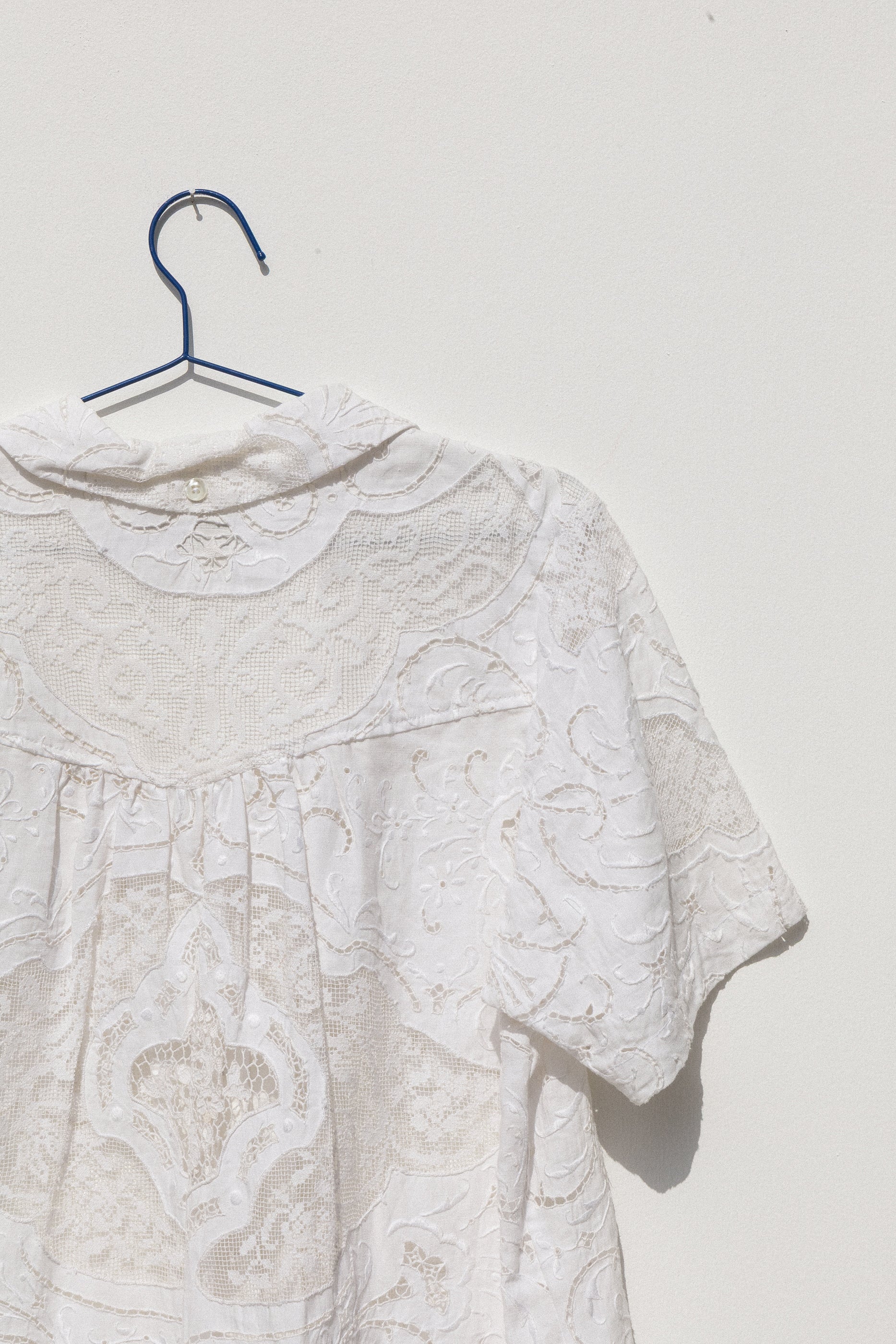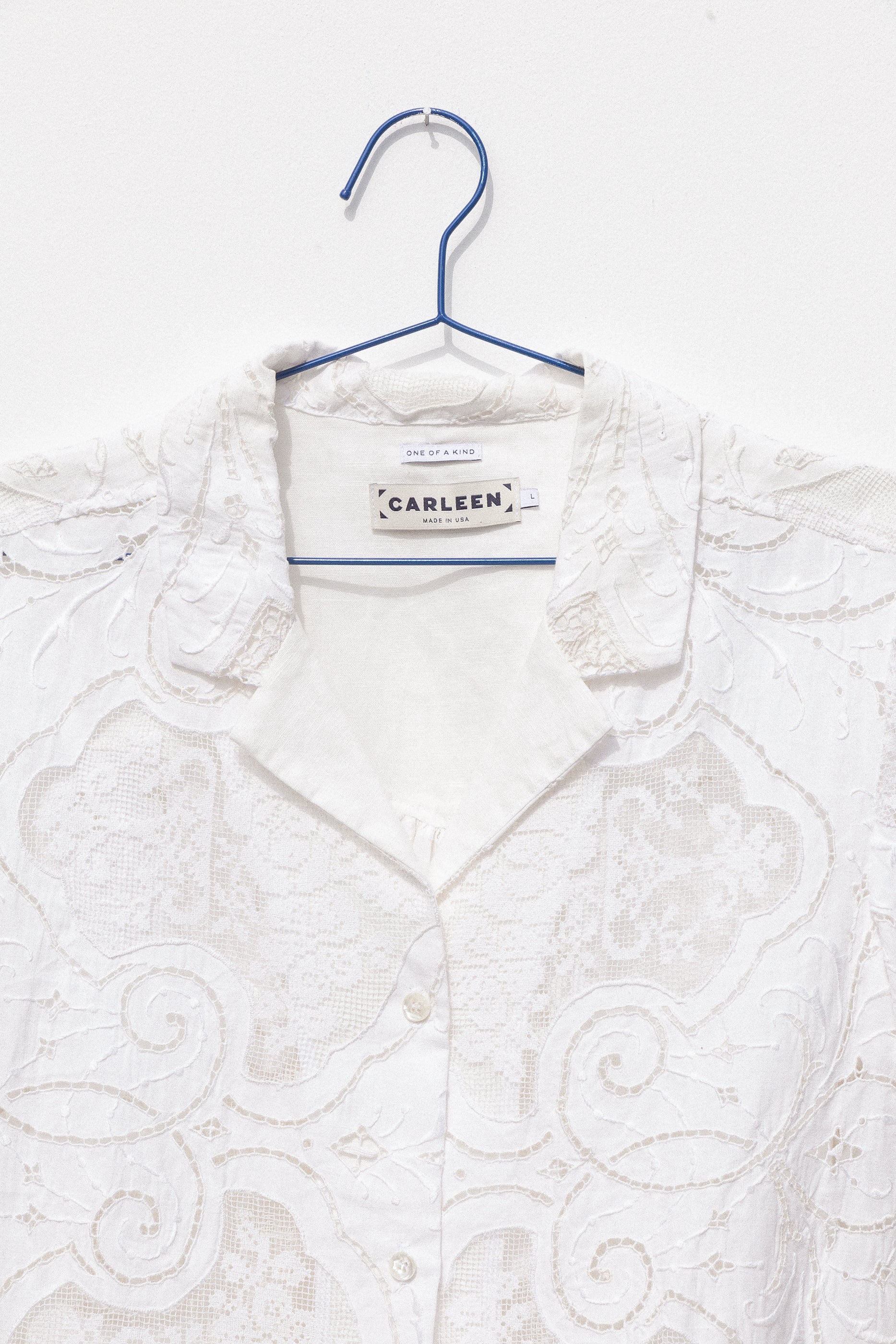 One of our favorite summer staples has returned! This Dinner Party Shirt is one of a kind, made from a vintage tablecloth sourced around southern California. For this style, we sought out tablecloths in shades of white with intricate and unique details - this one includes gorgeous lace details all over! The back features a pointed collar and yoke details. Runs true to size.
