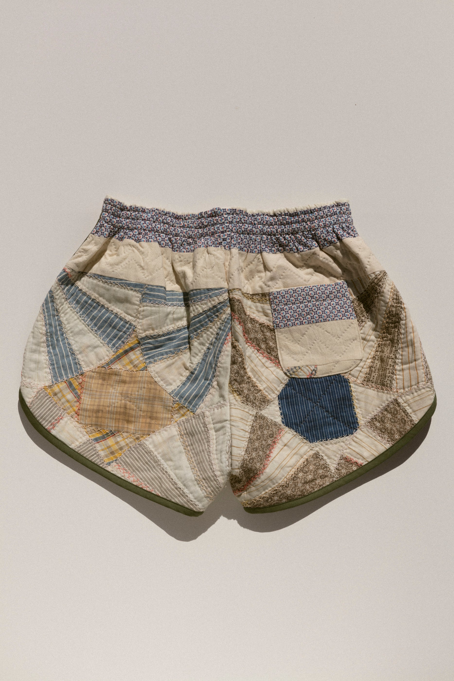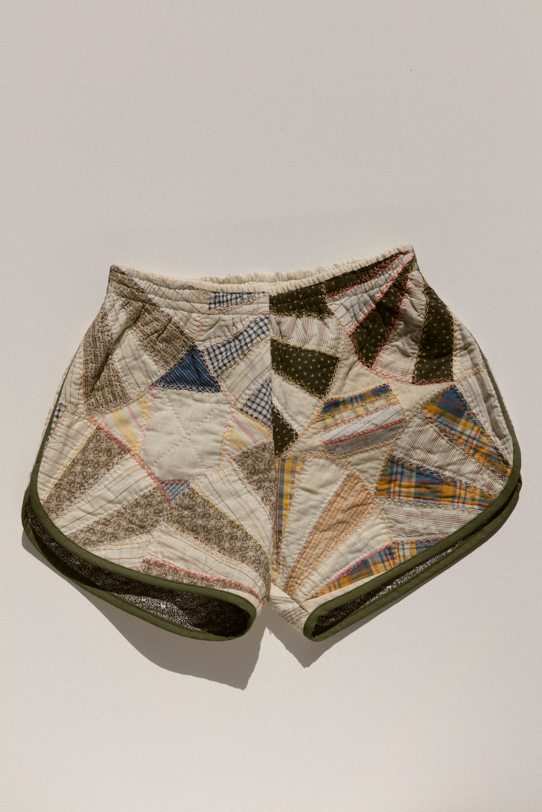 Our fan-favorite, one of a kind, Quilt Track Shorts. They have a single back pocket and elastic waist. Short but not tiny, and more flattering than you might expect.