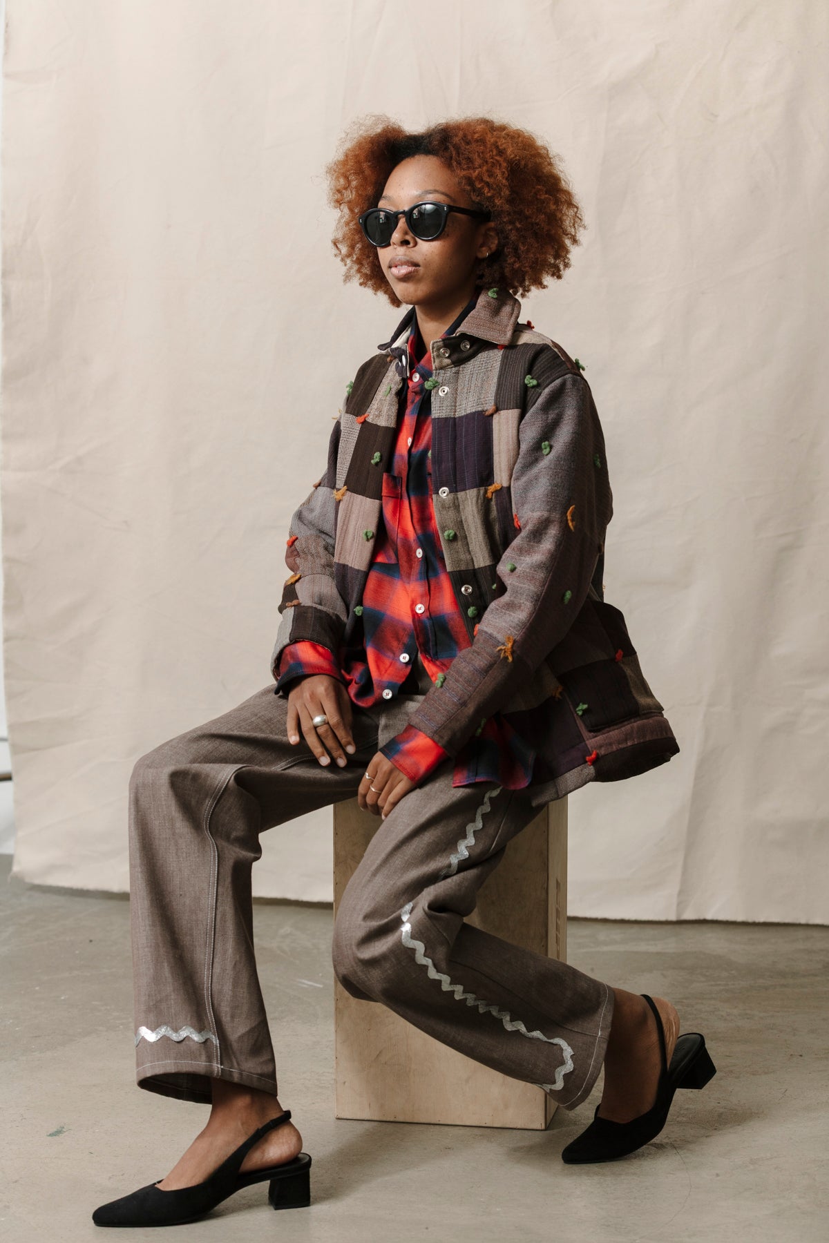 Party pants! Unwashed walnut denim and silver rickrack combine for fun and function. These will start off a little stiff and get softer every time you wear them to a party (even if the party is just coffee on a wednesday). Style runs slightly oversized, check measurements! Model is wearing a size up from her usual size, belted.