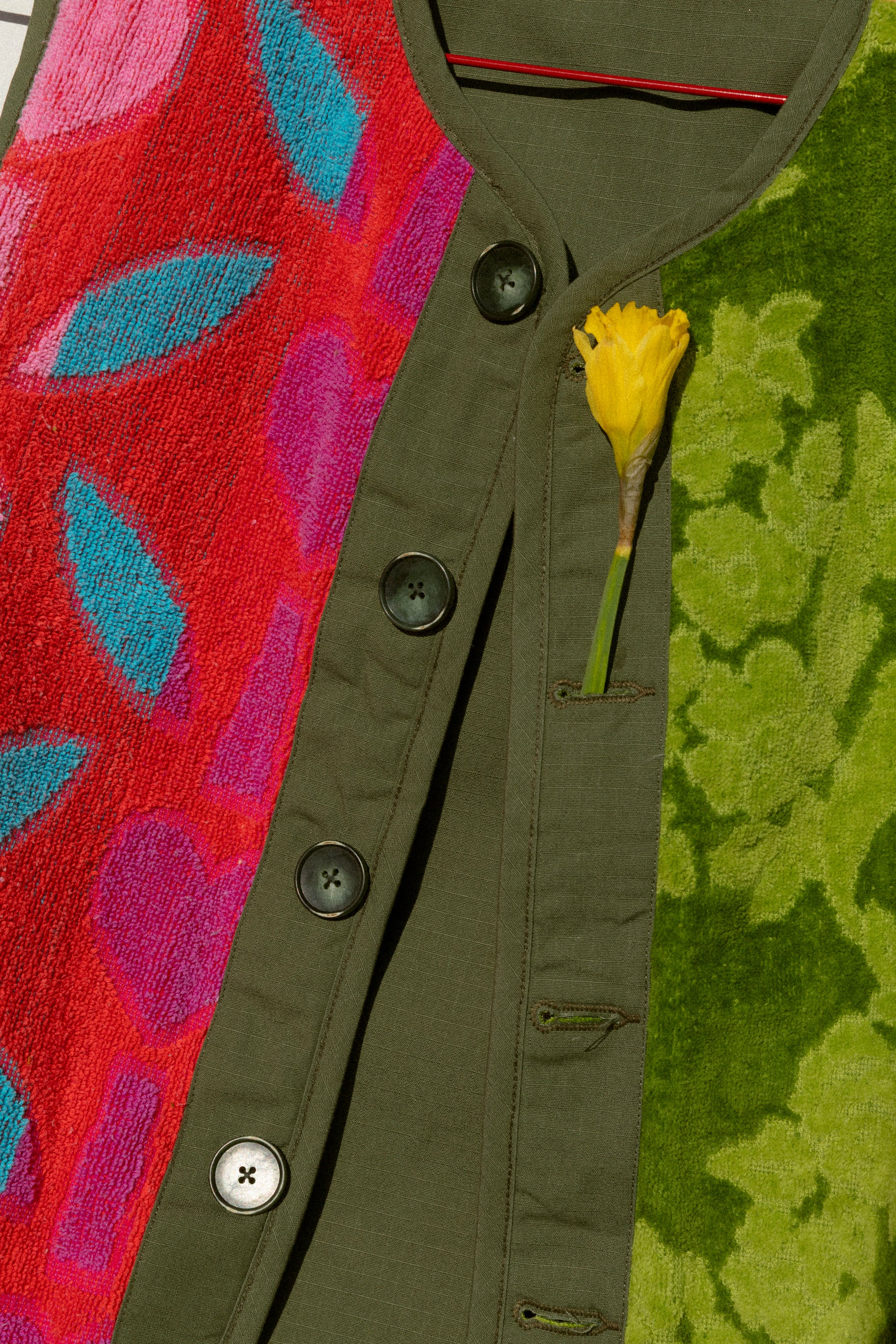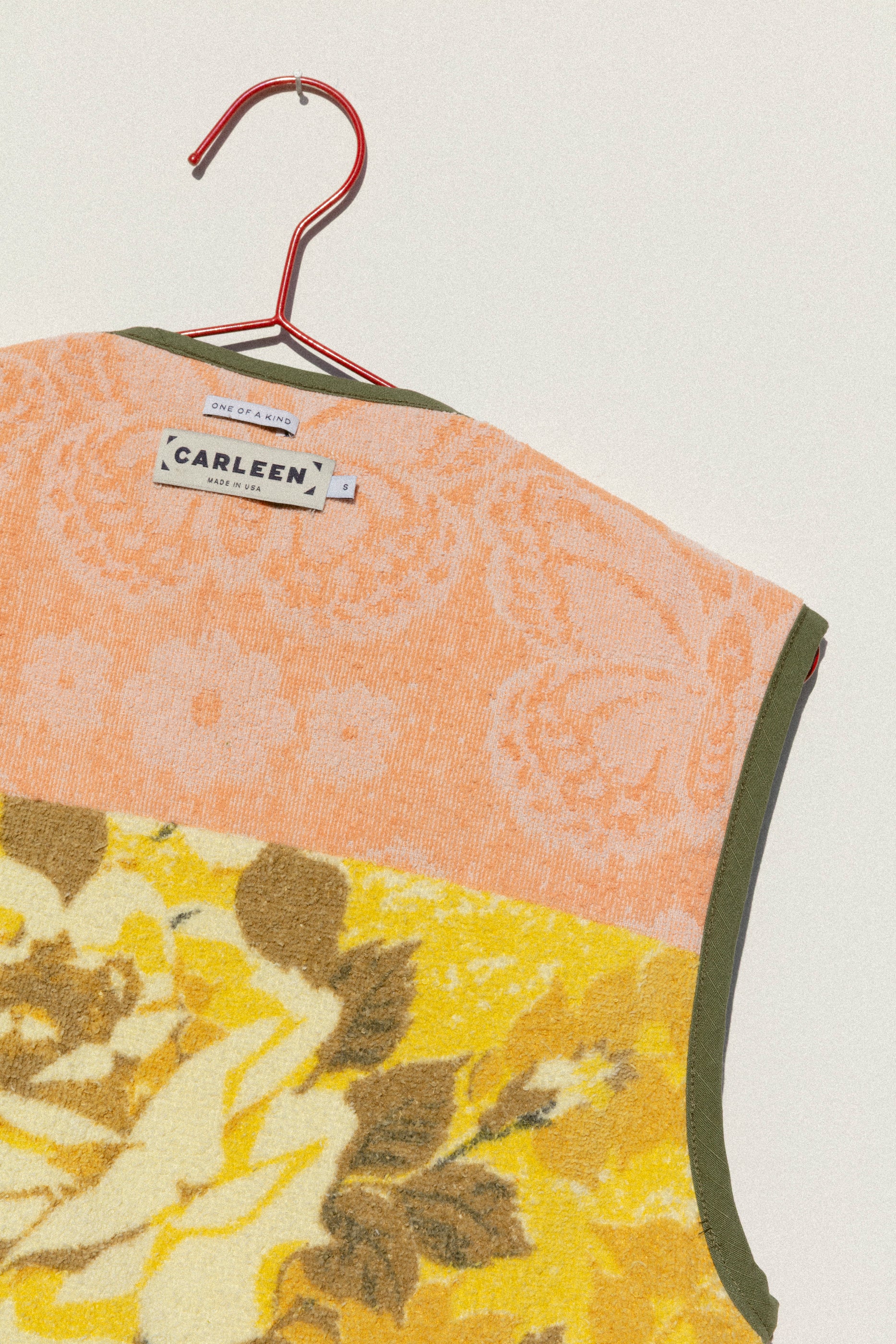 These fully reversible and one-of-a-kind vests feature a mix of vintage bath towels. We’ve anchored this vintage textile with sage green cotton ripstop and matching tonal buttons for when you’re looking to keep things more subtle. We love the layering possibilities- put it over a hoodie for added warmth (and color!) on days where it feels like the weather could do pretty much anything. Buttons on the interior and exterior make it fully reversible.