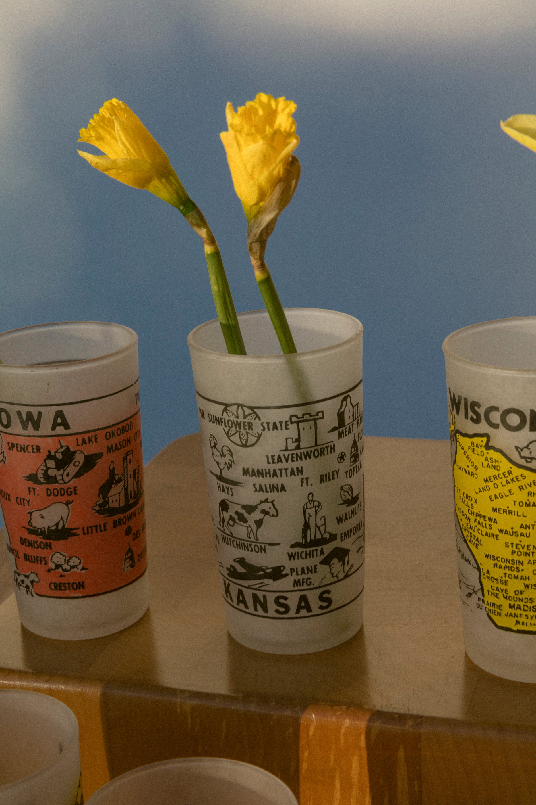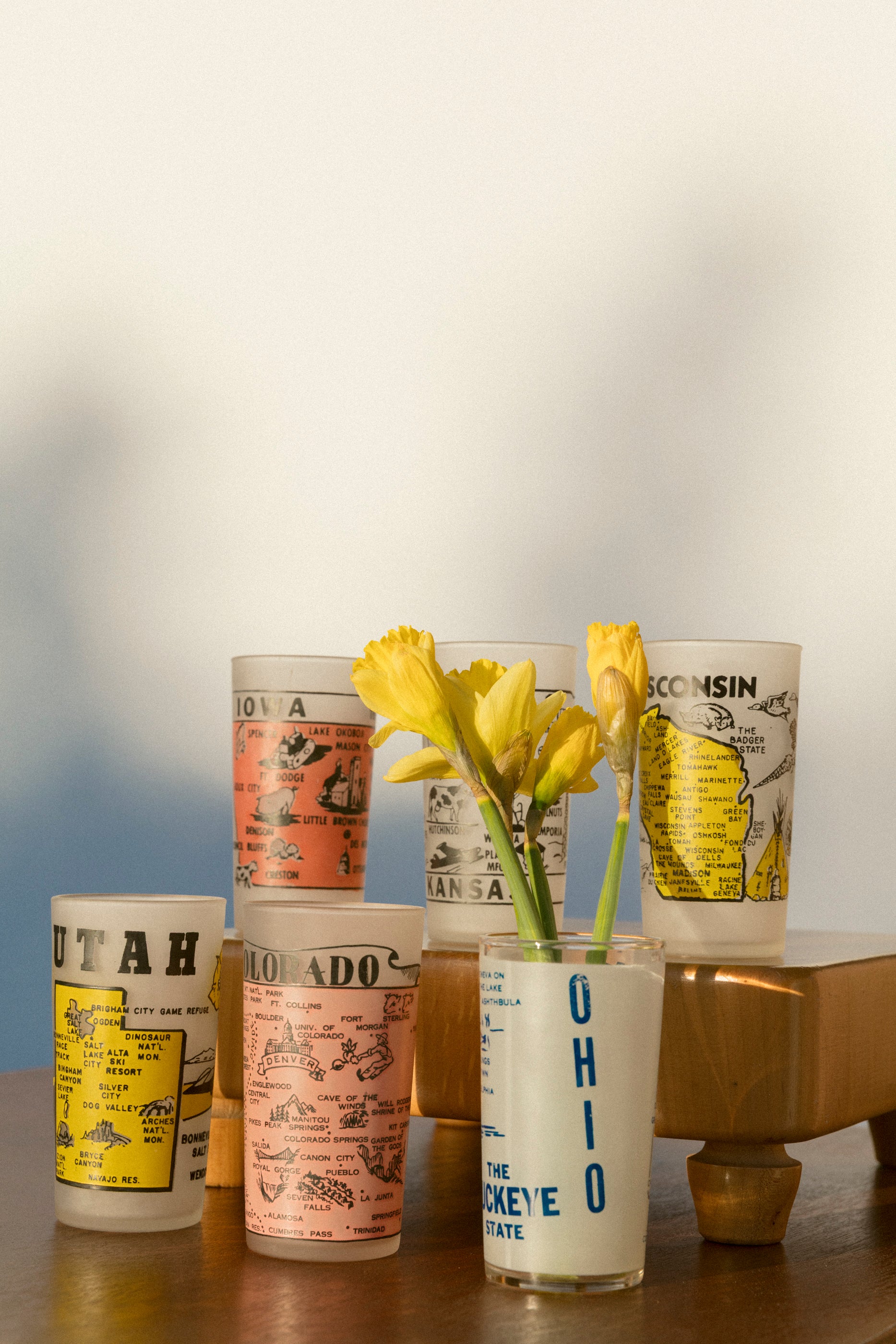 A cute state cup to remind you of where you're from or where you might be going. Maybe you need a water cup for your beside table or for your daffodils. These glass cups are a true vintage find and sourced locally in Los Angeles.