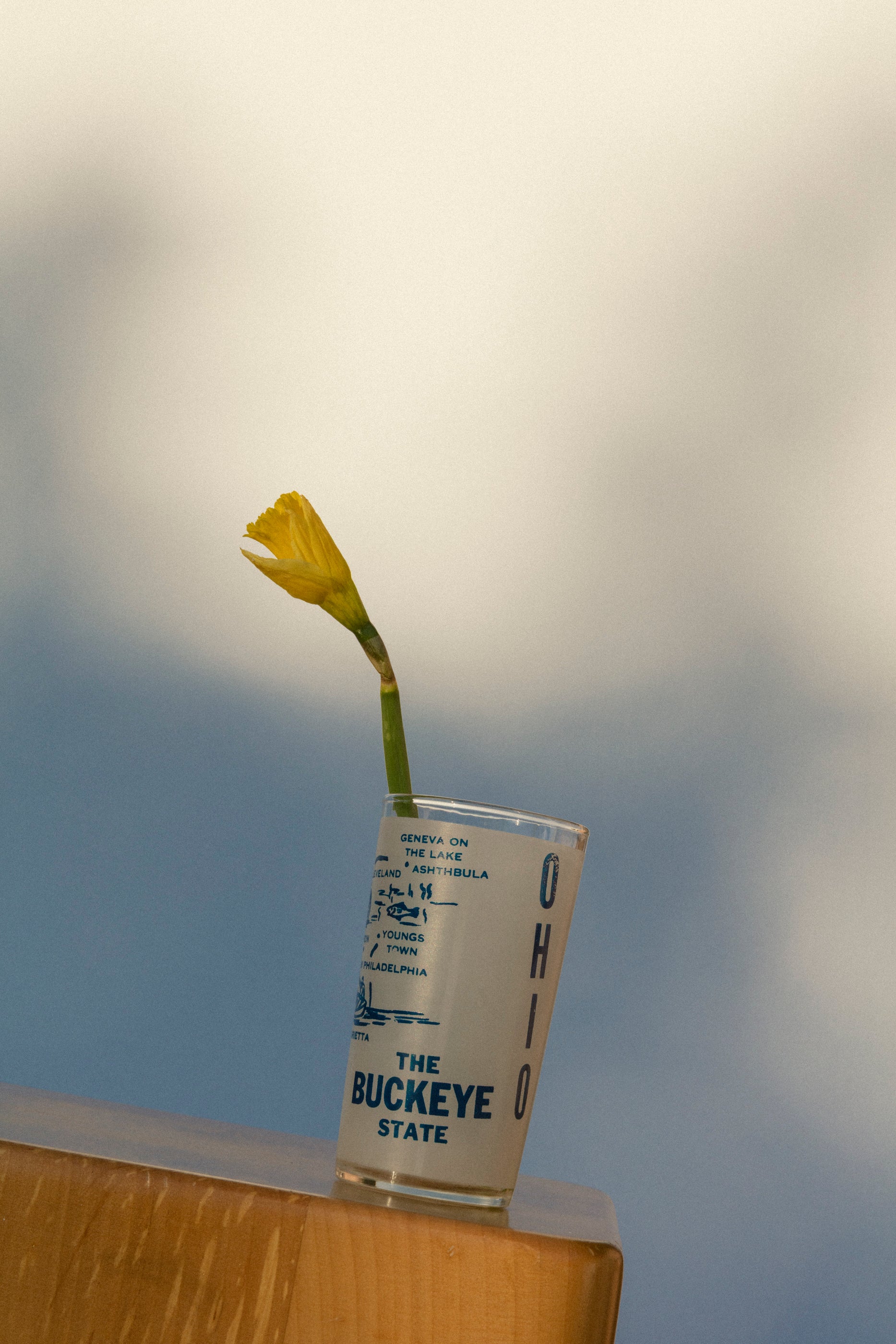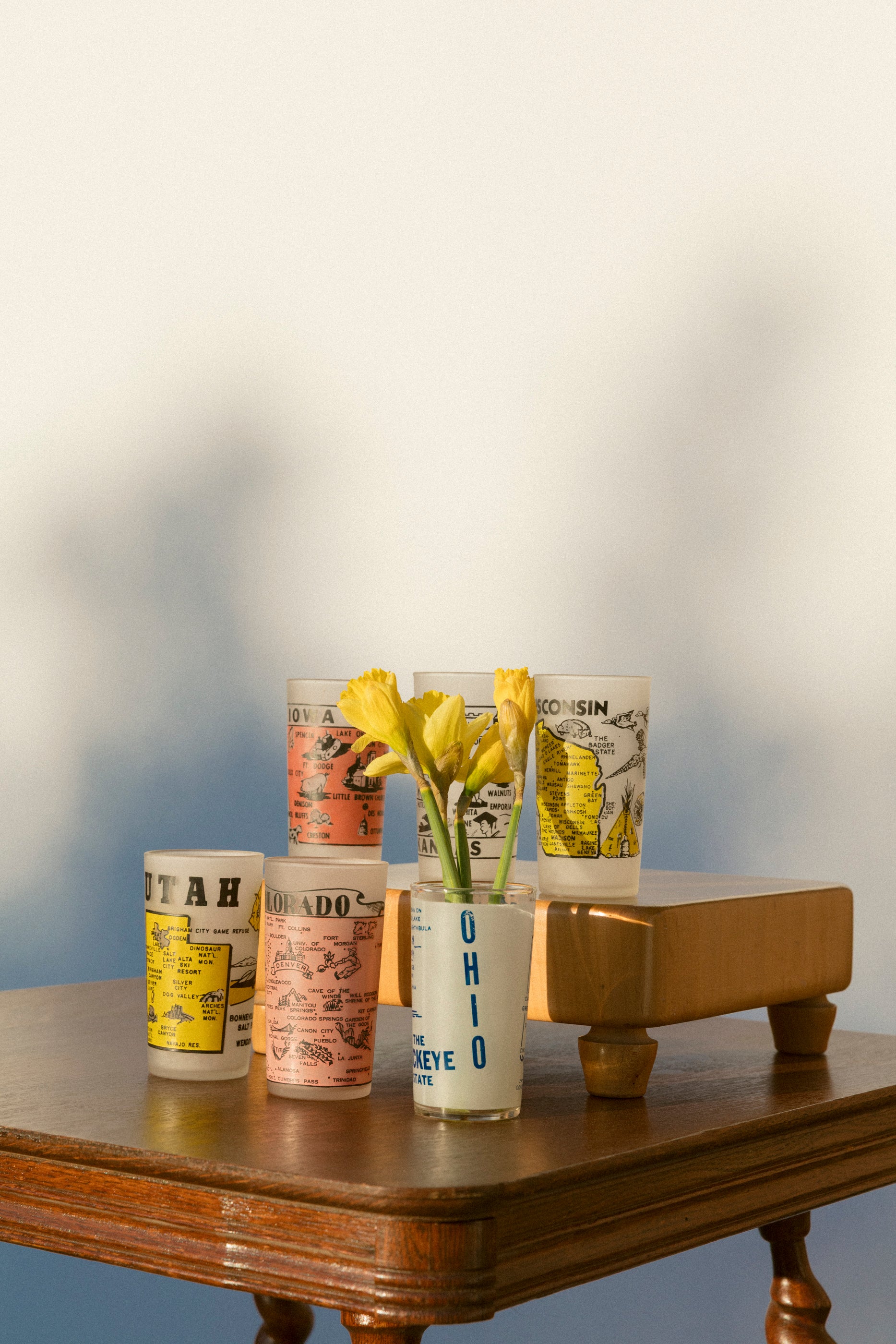 A cute state cup to remind you of where you're from or where you might be going. Maybe you need a water cup for your beside table or for your daffodils. These glass cups are a true vintage find and sourced locally in Los Angeles.